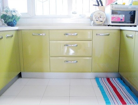 果綠色系的廚房,干凈又明亮,彩條防滑地毯,是貼心的設(shè)計(jì)。