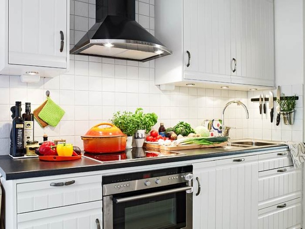廚房的櫥柜與墻面融為一體,餐具色彩豐富,形成一道風(fēng)景。