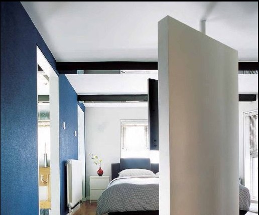 中戶型空間不大,所以在空間規(guī)劃上得特別細(xì)心??臻g小并不代表不精彩,一道轉(zhuǎn)墻的設(shè)計(jì)成為二層空間最大的亮點(diǎn)。分隔書房與臥室空間的是兩道半墻,其中一道可以自如旋轉(zhuǎn),關(guān)閉時(shí),兩個(gè)空間各自獨(dú)立,看電視的與看書的各不影響;而打開時(shí),兩個(gè)空間相互貫通,隔離而不疏離。