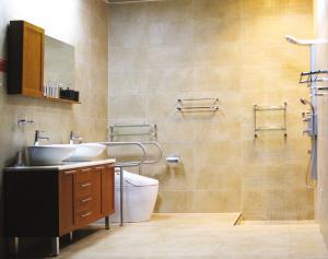 潔具:木色衛(wèi)浴柜符合老年人的色彩需求,柜體上雙手盆的選用充分體現(xiàn)了人性化的細節(jié),同時特別選用智能馬桶,融清潔、除臭、照明等功能為一身,馬桶旁專門設計雙側扶手,充分滿足了老年人的生活需要。