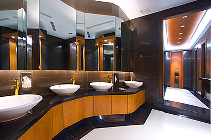 以華麗金屬色調(diào),搭配鮮紅的休憩椅,大片珠簾環(huán)繞中島化妝臺(tái)區(qū)域,水晶燈及金色雕框鏡子環(huán)繞其間,呈現(xiàn)金碧輝煌的雍容氣度。值得一提的是,其中一間廁所,針對(duì)仕女特別設(shè)置自動(dòng)沖水的下身盆,如此貼心的設(shè)計(jì),比五星級(jí)還五星級(jí),讓如廁也是一種人生的享受!
