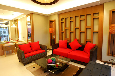中式家居風范與傳統(tǒng)文化的審美意蘊。墻面沒有過多的修飾,只用白色乳膠漆進行粉刷,地面采用了白色的石材,家具則以雕刻講究、造型典雅的木質(zhì)家具為主,配以紅色的靠墊、坐墊烘托出了居室的氛圍,表現(xiàn)了古典家具的內(nèi)涵。