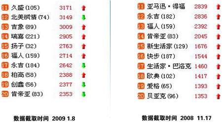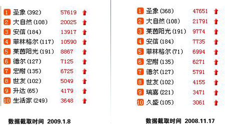相對(duì)與第一集團(tuán)的穩(wěn)定相比,第二集團(tuán)則競(jìng)爭(zhēng)激烈,各品牌之間大有拼個(gè)你死我活之勢(shì)。通過(guò)兩組不同數(shù)據(jù)的對(duì)比,能夠從去年11月份“活”到今年1月的僅有永吉、福人及肯帝亞三家,除了從第一集團(tuán)跌下來(lái)的瑞嘉和久盛外,其他的品牌被殘忍地?cái)D出了第二集團(tuán)。