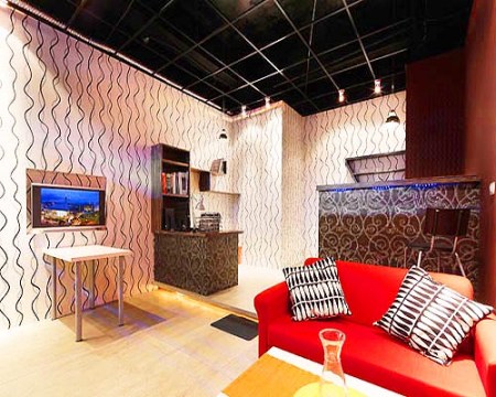 方案一:波普藝術風格以亮白及暗紅兩色壁紙將空間一分為二,暗紅色規(guī)則波紋線條壁紙從沙發(fā)區(qū)一路延伸至后方吧臺區(qū)塊,亮白色不規(guī)則波紋線條壁紙則占滿了大片室內空間;在休閑區(qū)選用安定感色系波紋,在工作區(qū)選用活潑明亮風格壁紙,具象的沖突感在設計師巧手下呈現微妙平衡,再搭以藤蔓編飾圖紋深色壁紙包覆的吧臺及工作臺,擺上大紅及亮白的造型沙發(fā),營造lounge bar氛圍,成為寓工作于娛樂的工作空間。