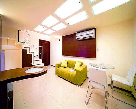 方案二:現代機能 實用至上 沙發(fā)背后的鐵刀木簡約背墻,既包覆住冷氣管線,在近門處一側并裝有感應式照明,用溫暖光線歡迎返家的居住者,另外三側亦設置間接光源,讓空間光影表情更生動。本案設定為投資用途,天花板的幾何方塊設計,遮掩丑陋的日光燈管,維修方便,且分段式開關發(fā)揮節(jié)源功能,明亮的光源,做為住屋或是小型工作室出租皆無問題。