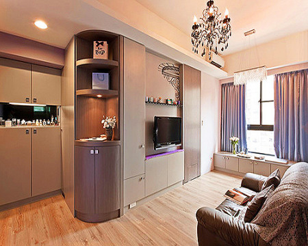 方案三:現代簡約風格 家具的設定特別選擇較低水平線的小型家具,客廳墻面不設置電視柜,選擇小型視聽柜、茶幾,讓挑高的空間感覺更加放大。以架高地板的方式,設置小階梯,將臥鋪與客廳明確分別開來,并利用兩者地板間的落差,規(guī)劃抽屜式的收納柜,增加小空間里的收納功能。