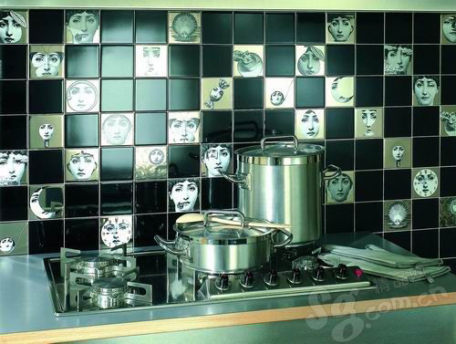 一張接近完美的古典少女的臉龐被框定在各種圖案的模板中,呈現(xiàn)出日月星辰、糖果花草的奇妙組合,加上模板的澄金亮度和黑色背景的烘托,讓普通的瓷磚也充滿奇趣美麗的氛圍。
