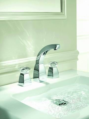 延續(xù)新巴洛克的潮流,借助純正鉑金的涂層裝飾方法,將鉑金的植物花紋環(huán)繞在面盆上下,用貴重的金屬色,結(jié)合華麗的裝飾品,使浴室環(huán)境設(shè)計提升至一個全新的檔次。這款龍頭,配有施華洛世奇水晶制成的把手,并分為清如水晶的自然色以及藍寶石般的中性藍色,簡直像精美的首飾一般。
