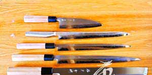 世界上三大名刀,大馬士革刀、馬來(lái)刀和日本刀。不過(guò)你又知不知道日本的菜刀也是很出名,是世界各大飯店都認(rèn)可的名刀?對(duì)于很多日本師傅來(lái)說(shuō),他們隨身所帶的那一套日本菜刀,就好比傳家寶,日日都是自己親手維護(hù)的,有些傳統(tǒng)的師傅甚至不讓自家老婆碰一下。尤其是在日本刺身師傅,他們除了需要有揀選鮮魚(yú)的眼光,更需要有處理刺身的刀法。在日本,刺身的切法分為厚造、薄造、角造3種。角造:以削刀切,由近刀刃位下刀,邊向下拉刀,完美的厚造可以令角造刺身挺立不倒。厚造:以一口方丁為原則,先切成條形再用直刀由上而下一刀切下去。薄造:以拖刀切出,由近刀尾位置下刀,邊用刀斜向后拖到刀尖,用盡刀鋒來(lái)切,才可以切出最薄刺身。所以他們一般隨身有5至6把專門處理刺身的刀,對(duì)這些刀他們重視非常,一般是不外借的。