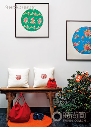 玄關(guān),是一個(gè)家最先要展現(xiàn)給大家的地方。如何在春節(jié)里把自家的玄關(guān)打造得與眾不同呢?讓我們來看這個(gè)玄關(guān):用美麗的民間花紙裝裱成的裝飾畫,開門見山地烘托出了節(jié)日的氣氛,中國(guó)風(fēng)味撲面而來。一條古舊的小條凳,兩個(gè)溫暖的靠包,營(yíng)造出家的溫馨氣息,又有實(shí)用效果。橙色的圓地毯,色彩艷麗,造型可愛,可以隨意地放置包袋。
