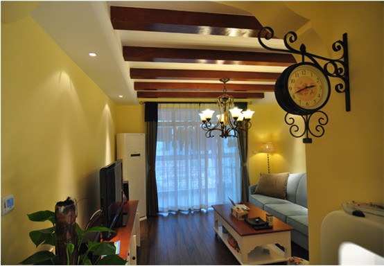 空間大背景是米黃色的,家具的選擇選用了偏白色、淡色的木質家具。而鐵藝的燈飾、吊鐘則具有民族、復古風特色。不大的空間營造出舒適的居家氛圍,暖洋洋的光線提升了家庭溫馨感。