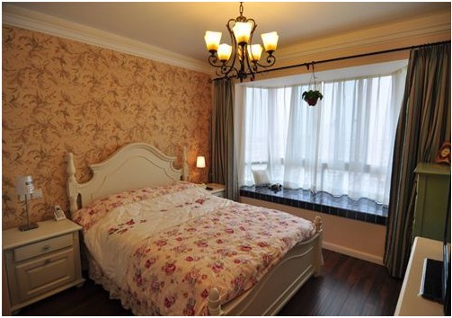 臥室布置很溫馨,色彩淡雅,格調清新。紗質的窗簾,風吹起的時候,輕飄飄的嫵媚。鐵藝的臥室吊燈,高雅感覺呼之欲出。碎花的床品與白色床架完美搭配,讓人感受到了清新明快的氣息。