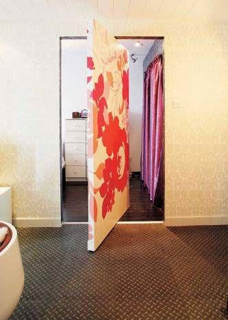 設(shè)計(jì)師為一對(duì)80后夫妻設(shè)計(jì)了一款彩繪旋轉(zhuǎn)門,巧妙地集功能性與時(shí)尚于一體。由于房間只有60平米,空間小,便用彩繪旋轉(zhuǎn)門把客廳和臥室巧妙隔開(kāi),墻壁和門合二為一,活動(dòng)的彩繪門墻讓主人進(jìn)出時(shí),顯出“柳暗花明又一村”的意境。