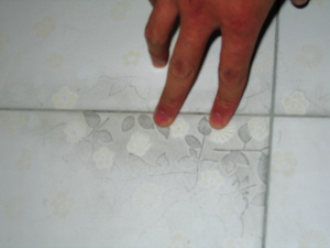 據(jù)何鐵柱敘述,裝修的時(shí)候,為避免地磚被硬物劃傷,他曾用廢紙箱蓋在地磚上,勾地磚縫時(shí),便發(fā)現(xiàn)有些地磚花了,就像被磨漏后沾了臟東西。因?yàn)檫€沒有裝門、吊頂、櫥柜及燈具,所以他又用廢紙箱將地磚保護(hù)起來??傻鹊降蹴斞b完后,他發(fā)現(xiàn)花的地磚更多了,也花得更厲害了。