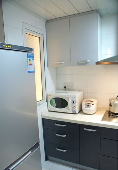 直線型的櫥柜,冰箱放置在窗戶的另一角,一點(diǎn)兒也不影響操作臺(tái)的使用。