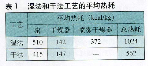 為了對(duì)這兩種生產(chǎn)工藝的生產(chǎn)成本作一個(gè)簡(jiǎn)單的比較,表1對(duì)比了兩種工藝的熱耗。從表中可以看出,“巴西干法”工藝的平均熱耗明顯較低.而且區(qū)別最顯著的是窯的熱耗,說(shuō)明“巴西干法”工藝之所以經(jīng)濟(jì),并不僅僅因?yàn)閲婌F干燥器的能耗問(wèn)題。