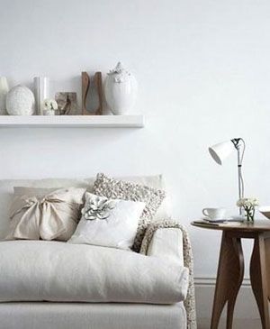 純白色墻漆奠定室內(nèi)主色調(diào),純白沙發(fā)上隨意堆砌數(shù)個白色布藝靠墊,或編織而成、或以雛菊、蝴蝶結等裝飾,美觀大方。來自The Conran Shop的純木小桌給白色世界加上了難得的一筆自然色。臺燈、咖啡杯、水杯、碗、花等一律白色。沙發(fā)背后墻面架子上,瓷花花瓶、木質(zhì)花瓶、折疊花瓶等將空間裝點得越發(fā)生動。