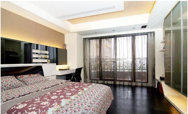 這個(gè)主臥里還有一個(gè)外帶陽臺(tái),整體現(xiàn)代感十足,只在床品軟裝上延用了中式的風(fēng)格。