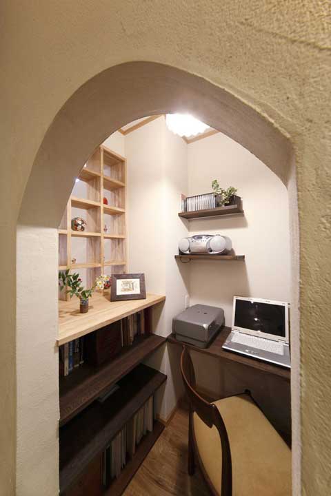 對應(yīng)著廚房的另一個(gè)角落,原先可以說一個(gè)家居死角,改良后成為一個(gè)小小的工作間,加以拱形的門設(shè)計(jì),又多了一些些活潑可愛的格調(diào)。
