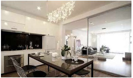 地板由客廳直接鋪裝到廚房,令兩者之間視覺(jué)上貫通性極佳,還增加了空間延伸的感覺(jué)。倉(cāng)儲(chǔ)柜美觀實(shí)用,配備六把餐椅的大餐桌布置得很正式。操作臺(tái)作一字型設(shè)計(jì),寬大的餐桌烹飪時(shí)可以作臨時(shí)備菜臺(tái),使用起來(lái)很方便。