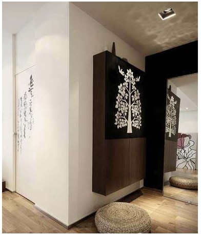 把電視臥入墻里,使屏幕與墻體保持水平,在兩側(cè)均勻打上小孔不會(huì)影響聲音效果。書房門運(yùn)用隱藏式的設(shè)計(jì)理念,沒(méi)有制作門口,使得視聽(tīng)墻具有很好的整體效果,書房門面寫著古詩(shī)書法,宣紙質(zhì)感配以草墩將一絲禪意緩緩的流露出來(lái)。