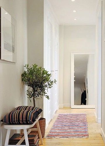 進入眼簾的是玄關(guān)過道處,滿目的白色。白色的墻面提亮了走道的光感,而原木色的地板則又加入自然純樸的感覺。這樣的空間不會讓人覺得太冷,搭配起來更有現(xiàn)代感。白色的墻面、白色的吊頂讓空間提以拉升,它的光感已經(jīng)解決了空間高度問題。