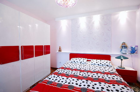 次臥,背景墻的裝飾紋理+紅白相間的衣柜+圓點(diǎn)床品,整體舒適