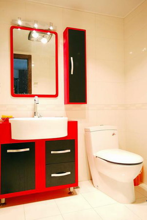 主衛(wèi)浴,紅白黑三色搭配,臺(tái)下柜起收納作用。
