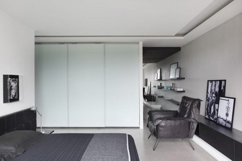 皮革裝飾的床頭與皮質(zhì)單人沙發(fā),透露出硬朗的男性特質(zhì)。黑色調(diào)的運(yùn)用更具有現(xiàn)代派的未來感。