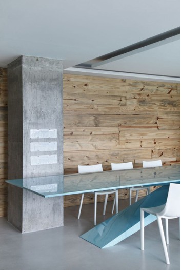 公寓內(nèi)的裝修采用聚合水泥,墻壁則選用松樹木拼接而成,原汁原味的設(shè)計自然又環(huán)保。而桌與椅的色彩延續(xù)了客廳的色調(diào),湖藍(lán)點綴白色,清新淡雅!