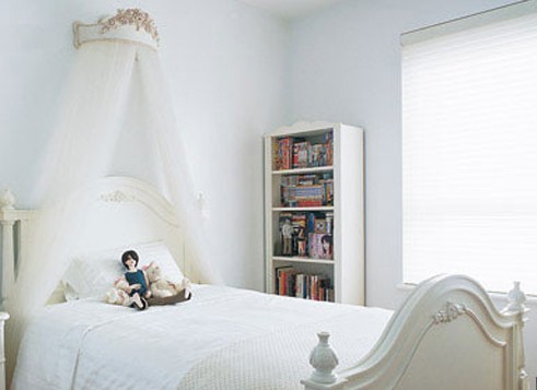 霧藍(lán)色的女兒房,純凈無(wú)瑕,滿是年少的淡淡輕愁與憧憬。漂亮的床冠裝飾,猶如公主皇冠高貴不凡。