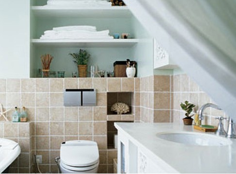淡綠色墻面與淺棕色地磚,以及生命力旺盛的盆栽都使浴室鮮活起來(lái)。置身與清淡色彩之中,卻也能撥動(dòng)人們的心弦。