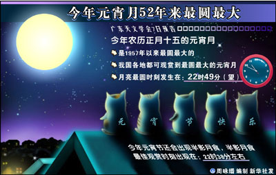 中新網(wǎng)2月9日電 今日是元宵佳節(jié),戀人們除賞彩燈、猜燈謎外,還可欣賞到52年來最圓最大的月亮。據(jù)香港《文匯報(bào)》報(bào)道,今晚最佳賞月時(shí)間是晚上10時(shí)49分。