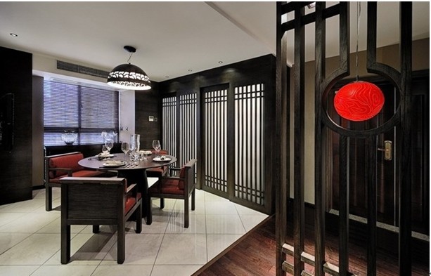 餐廳空間利用簡單的墻面木板和壁紙等材料來打造出一個很簡單又不是檔次的氛圍。其簡單的造型讓沉悶的中式風格得到了舒緩。一張圓形餐桌在整個空間的烘襯下,配上穩(wěn)重的深紅色,不管從視覺上還是舒適度上都運用的相當?shù)轿弧?/p>