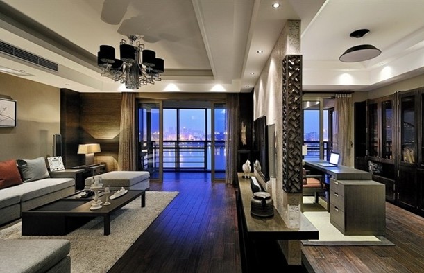 與餐廳過道相比,客廳書房運用的顏色更為明亮些,再加上落地的窗戶、通透的采光,讓人有豁然開朗的意境??蛷d的墻面材料依然選用木飾面和壁紙緊緊相扣,大氣、沉穩(wěn)而不失檔次。