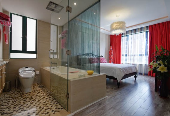 主臥是和藹的米色,這似乎是該居室中最為淡雅的色調(diào),營(yíng)造出安寧的睡眠環(huán)境。紅色的窗簾、中式格調(diào)的紅色柜子,都為這分寧?kù)o制造了亮點(diǎn),無(wú)須太多,寥寥數(shù)筆即可達(dá)到與眾不同的效果。拆除主臥和主衛(wèi)的一墻之隔,以玻璃代替,透明隔斷,視野通透。