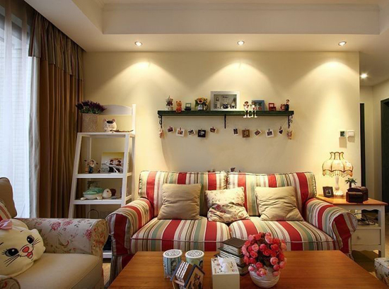 客廳的沙發(fā)色彩上都是溫馨的,有艷麗的紅也有溫馨的淡黃更有簡約的田園感。這個客廳里時刻還會出現(xiàn)童真時刻,80后的小夫妻總是童真未泯。