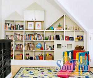 收納的架子并不是一定要在方正的墻面才可以做,像異形空間同樣適用,只需把頂端做成“蓋子”就行,造型反倒更有趣,圖中這個兒童游樂室就是完美范例。