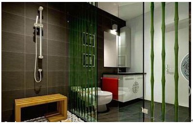 鮮艷的玻璃隔斷,打破了衛(wèi)生間的傳統(tǒng)色調(diào),空間看上去更加靈動。綠色竹林搭配上淋浴區(qū)鵝卵石的鋪設(shè),當(dāng)水從石縫流走猶如林子的小溪,使人有一種進(jìn)入大自然的感覺。