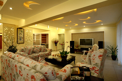 這個空間里運用最多的就是淡金色了,是燈光的映稱下顯得溫馨亦常。田園花朵在布藝沙發(fā)上,這個空間里依然大氣,依然溫馨,這是家的感覺。