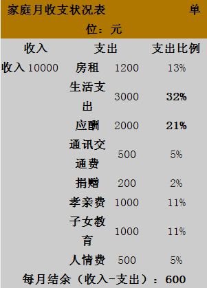 房租:1200元/月。吃飯:家用,3000元/月。應(yīng)酬:1500--2000元/月。手機(jī)交通費(fèi)用:500元/月。支助貧困山區(qū)小朋友,200/月。每月固定給父母親生活費(fèi):1000元/月。小侄兒的學(xué)習(xí)基金:因?yàn)楦绺鐥l件一般,所以我現(xiàn)在開(kāi)始存錢(qián),負(fù)擔(dān)我小侄兒成人后的學(xué)習(xí)基金。1000元/月。偶爾特殊費(fèi)用,如朋友結(jié)婚,生日等,500--1000元/月。