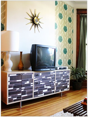 永不過時的拼接風設計,深受年輕人的喜愛。色塊拼接的電視柜可呼應潮流的單品。背景墻綠色的球狀圖片搭配金屬質感的太陽神鐘,讓整個空間有著古巴比倫的風味,綠色的點綴有著初春的氣息。