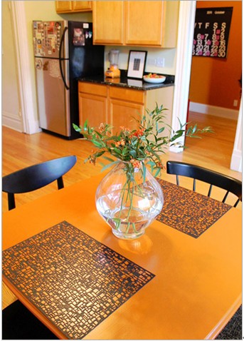 生機勃勃的花藝點綴居室一角,清新而鮮活,橙色的小花瓣也是特意選擇的,與整個空間色調向和諧。橙色的小飯桌,也很好的表達了空間的主題色調。斑駁的小桌墊增添了色彩的層次感和立體感。冰箱上可愛的小裝飾俏皮和生動。