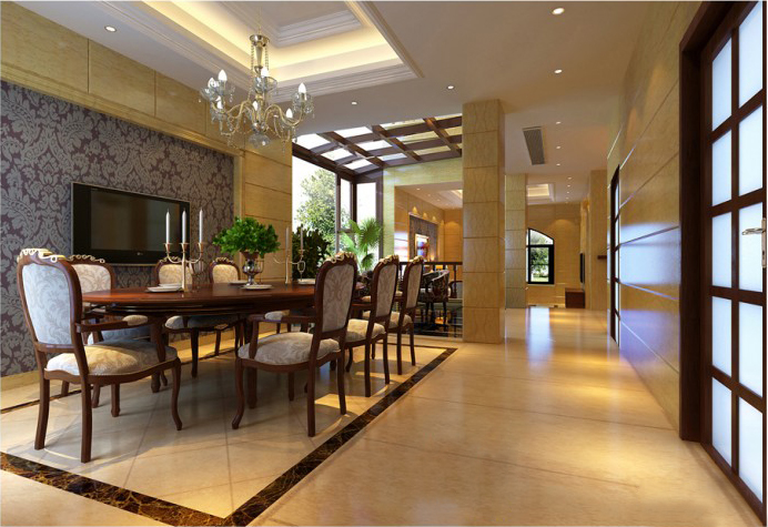 雅致的背景造型、考究的配飾、精湛的工藝,均是現(xiàn)代與古典相融的結(jié)晶,讓主人的審美情趣在優(yōu)美的線條、和諧的色調(diào)中自然流露。從玄關(guān)到客廳再到餐廳,空間流暢通明,名貴內(nèi)斂的淺調(diào)天然石料是地面和墻身的主材,石材與原木飾面墻壁形成鮮明而自然的對(duì)比。純凈的米色奠定了居室的基調(diào),放棄傳統(tǒng)歐式風(fēng)格中繁復(fù)的曲線與雕花后,明快的直線條勾勒出空間的清爽氣質(zhì)?!】蛷d的沙發(fā)背景運(yùn)用了西班牙米黃仿古石飾面中間用石材線條內(nèi)貼墻紙,墻紙中間掛上一幅藝術(shù)油畫,視覺效果既豐富又有立體感。一套大氣的組合歐式沙發(fā)配上實(shí)木的茶幾顯得主人家的品位。并彌漫出一份現(xiàn)代而古典的韻味。