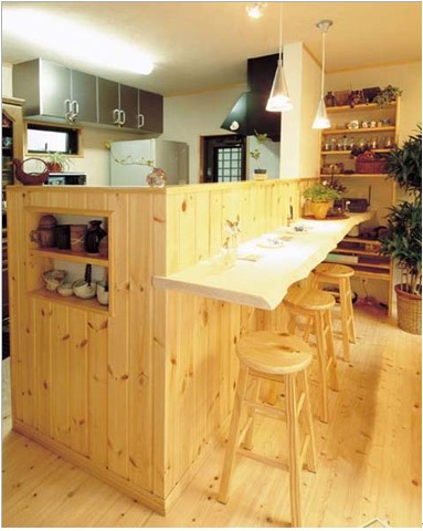 木制的吧臺作為廚房和客廳之間的分隔點(diǎn),閑暇時(shí)可在此品紅酒。松木的吧臺與地板,加上柔和的燈光,把簡單的廚房和客廳渲染的很是溫馨。