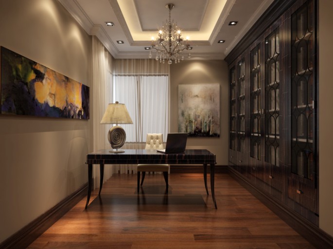 大氣簡(jiǎn)約的書房,最為實(shí)用的收納書柜正好是一面墻壁。