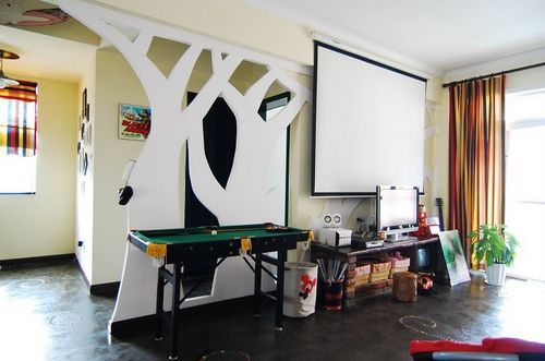 客廳的燈是不是很原始,很粗礦但也經(jīng)濟哦。電視背景墻旁邊這枝丫狀的玩意,還挺好看的,下面還放了一個臺球桌,家居休閑娛樂一好地方。