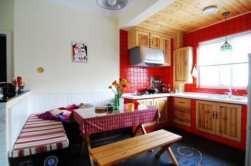 屋子面積不大只能選擇這種開放式廚房了,為了區(qū)分特地半人高的隔斷墻,櫥柜與餐椅選用了實木本色,餐桌上紅格子餐布,充分的體現(xiàn)了鄉(xiāng)村的風格。