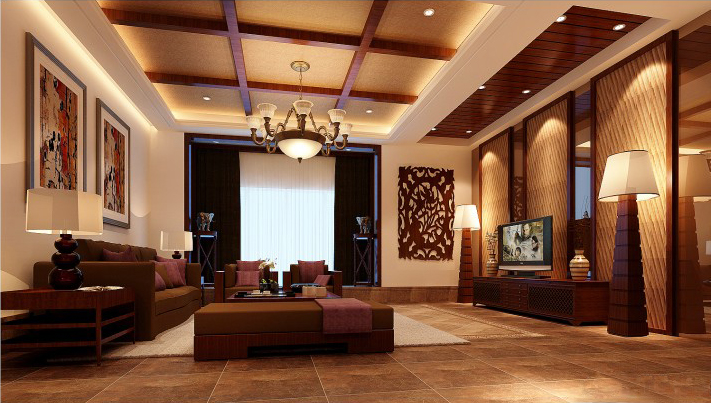 客廳的吊頂采用的是石膏板造型頂,頂上用的是木方做裝飾,電視背景上面的頂也是用實木條板做的裝飾,客廳的頂整體看起來還是挺穩(wěn)重的,中式的客廳吊燈就是歐式的了,因為中式的燈找來找去沒有質(zhì)感好又大氣的,就挑了盞歐式鐵藝大吊燈。這盞燈是鋅合金的,不生銹。買燈千萬別買電鍍的,沒幾年就斑駁得不能看。電視背景是純粹的中式風(fēng),不過其實算是中式屏風(fēng)的變種。配上棱形的落地臺燈,客廳的地面鋪的800*800是防古地磚??蛷d的背景沒有做什么裝飾只是掛了兩幅油畫。深顏色的布藝沙發(fā)。