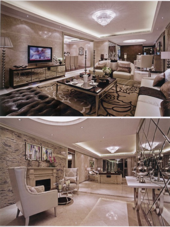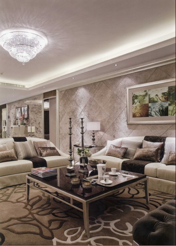 這個(gè)客廳空間墻面使用大理石,這幅大圖讓我們看清它細(xì)部的雕琢、鑲嵌和鏡面工藝呈現(xiàn)出豐富的視覺效果。家具與施華洛奇水晶吊燈與玻璃飾品精心搭配,似乎連那幅油畫也是無價(jià)的。